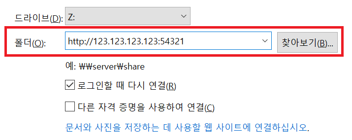 2) 폴더 항목에 로컬주소+포트번호 입력하기