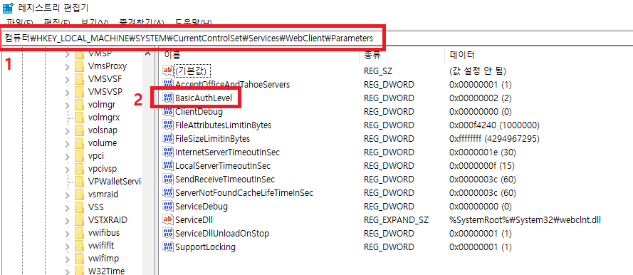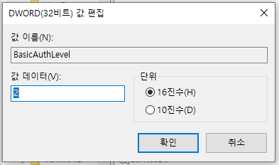4) BasicAuthlevel를 더블클릭 후 값 데이터를 1에서 2로 변경한다.