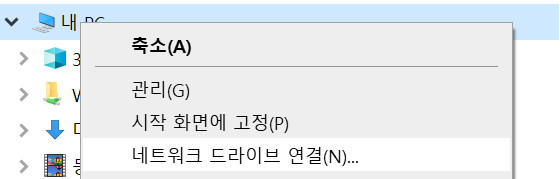 1) 연결할 컴퓨터 내 컴퓨터 들어가 내 PC 우클릭 - 네트워크 드라이브 연결 클릭